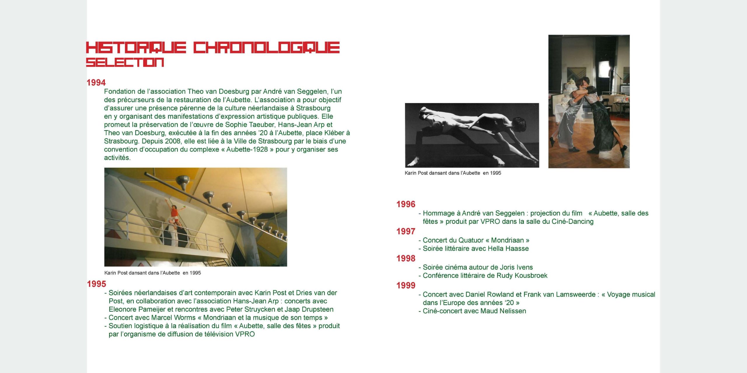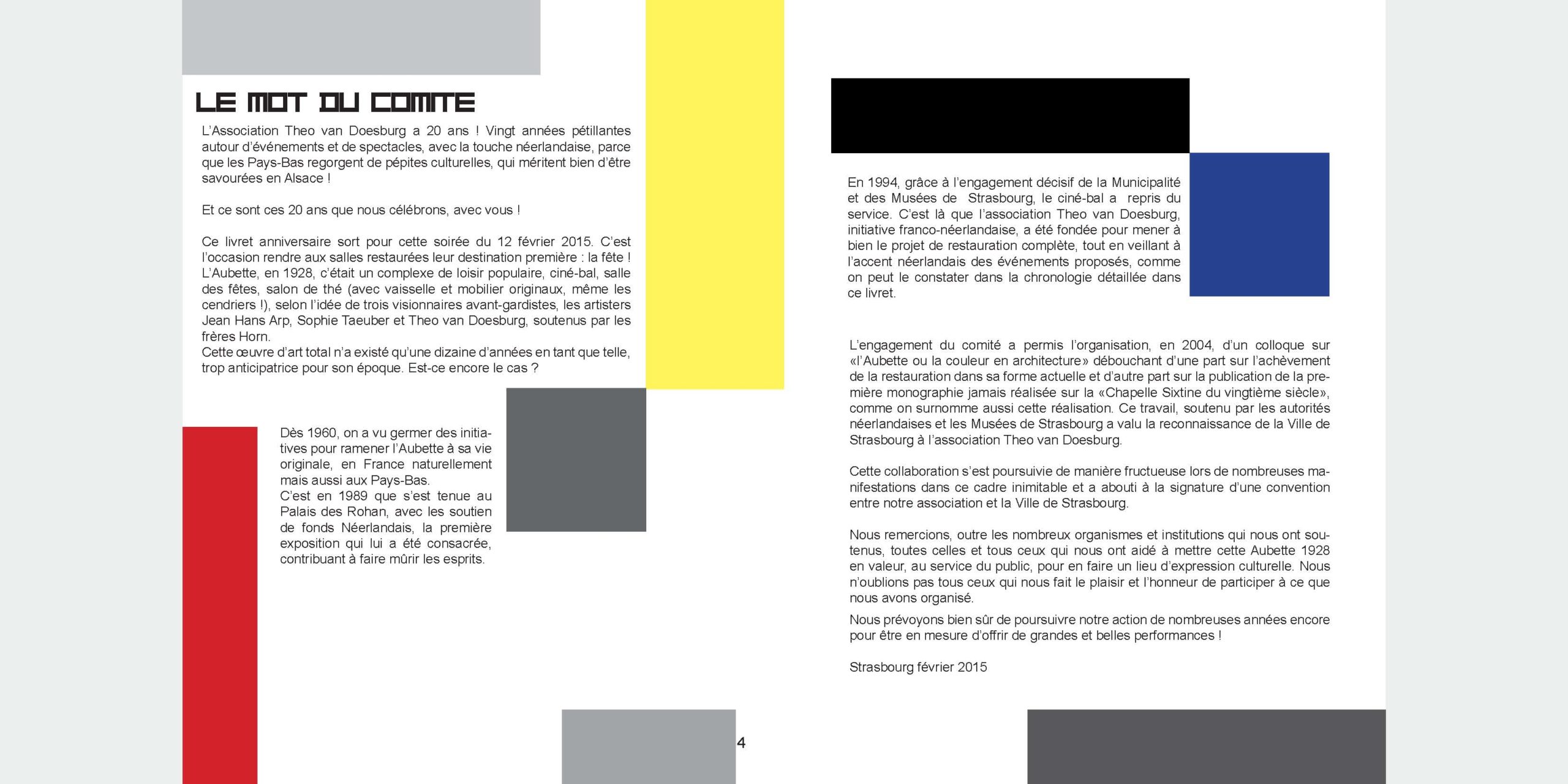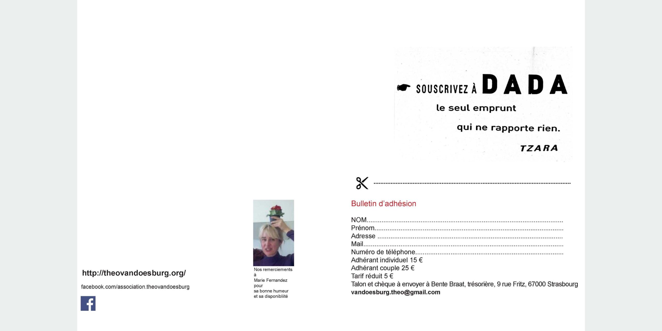Sur une durée de vingt ans, à partir de sa fondation, le livret donne un aperçu des initiateurs, des acteurs, des promoteurs et des réalisations de l’association Theo van Doesburg présenté d’une façon dadaludique, les tout agrementé de divers images à coller selon les envies de l’acquéreur-e.