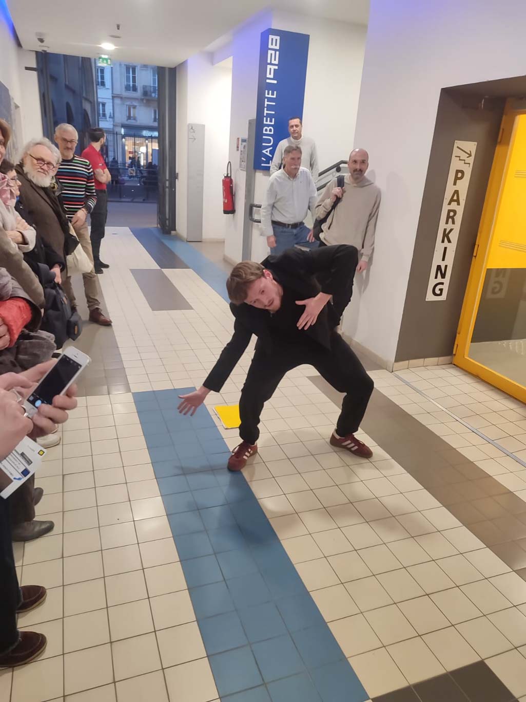 Surgissait ensuite de la porte du parking sur une musique de Duke Ellington (datée de 1928 !!!) Ronan Primas, danseur, qui interagit avec le passage tout en proclamant un texte écrit par Simon Vincent sur les artistes et les lieux.