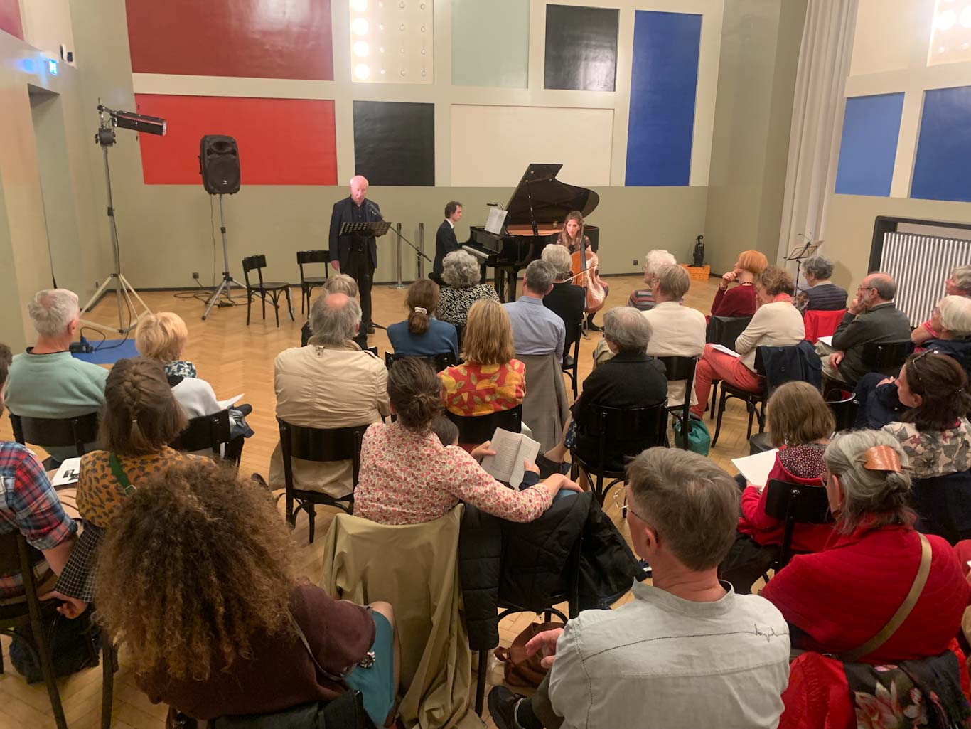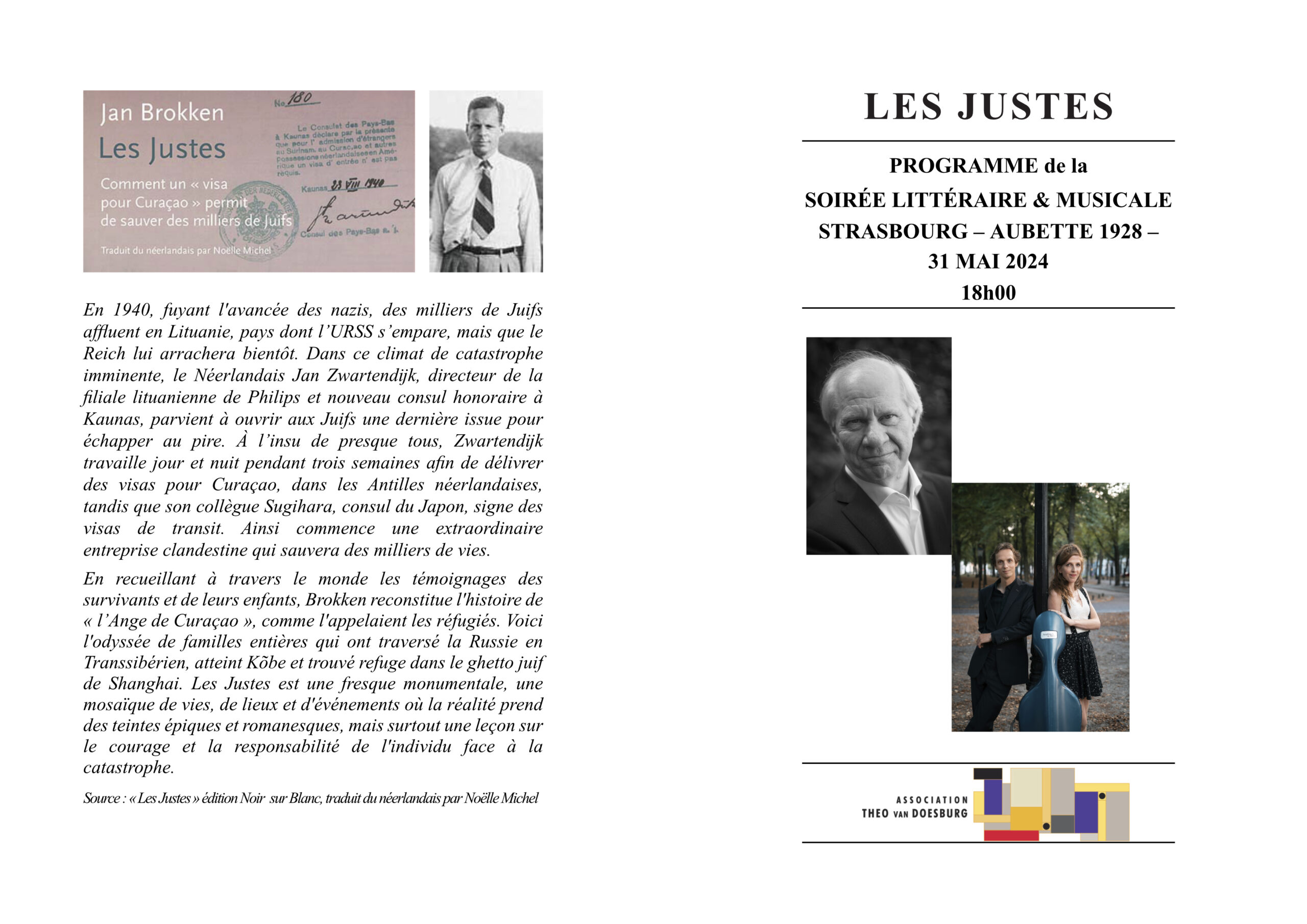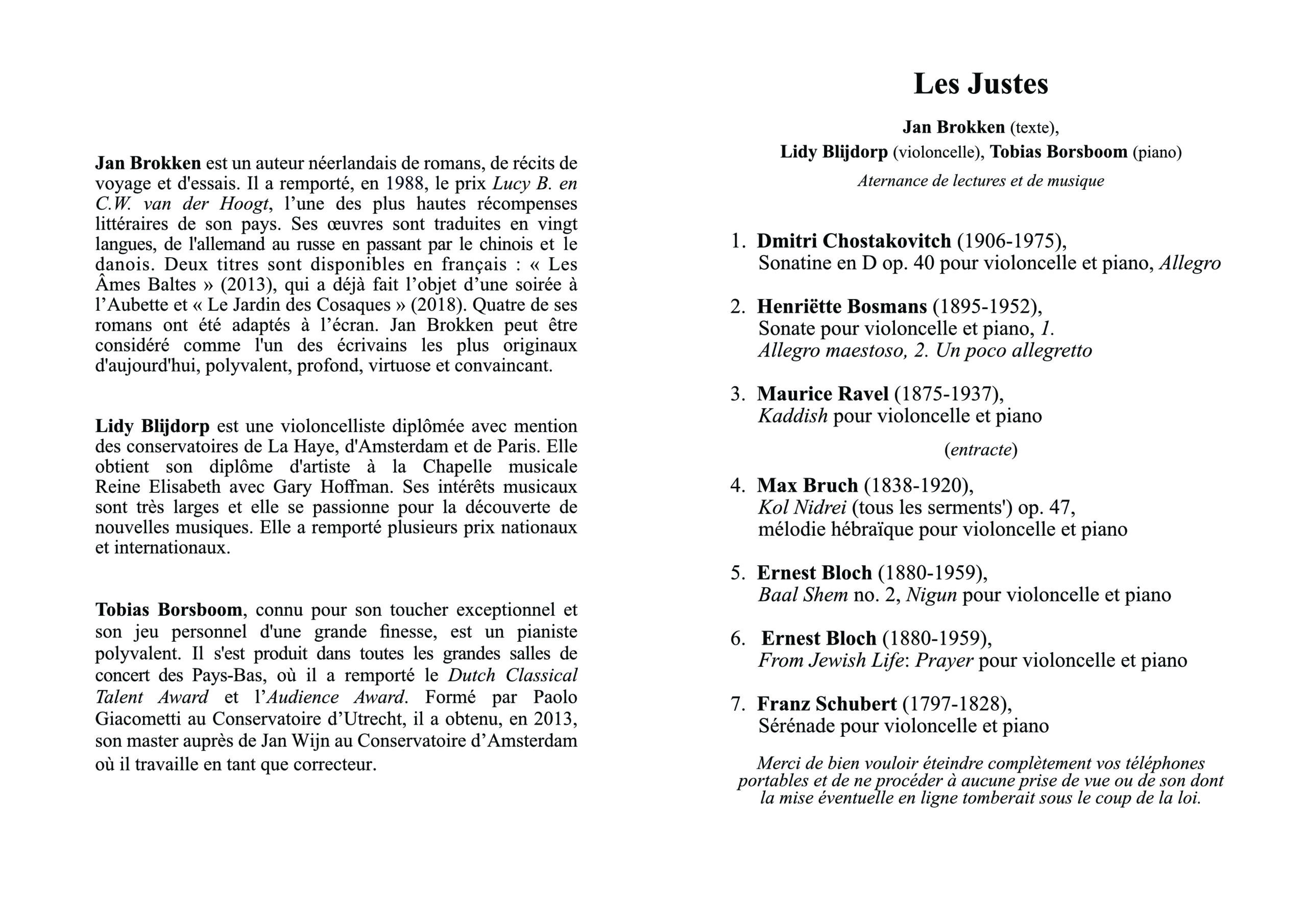 Jan Brokken a lu des fragments de l’œuvre qui décrit le destin de nombreux Juifs en fuite dans une épopée passionnante et qui brosse un tableau saisissant de cette terrible époque. Les lectures ont été rehaussées d’intermèdes de musiques classique et contemporaine en symbiose avec les témoignages des survivants. Lidy Blijdorp (violoncelliste) et Tobias Borsboom (pianiste) ont magistralement interprété ainsi des pièces de Bosmans, Bloch, Bruch, Chostakovitch, Ravel et Schubert. La salle était comble et le public a été comblé.