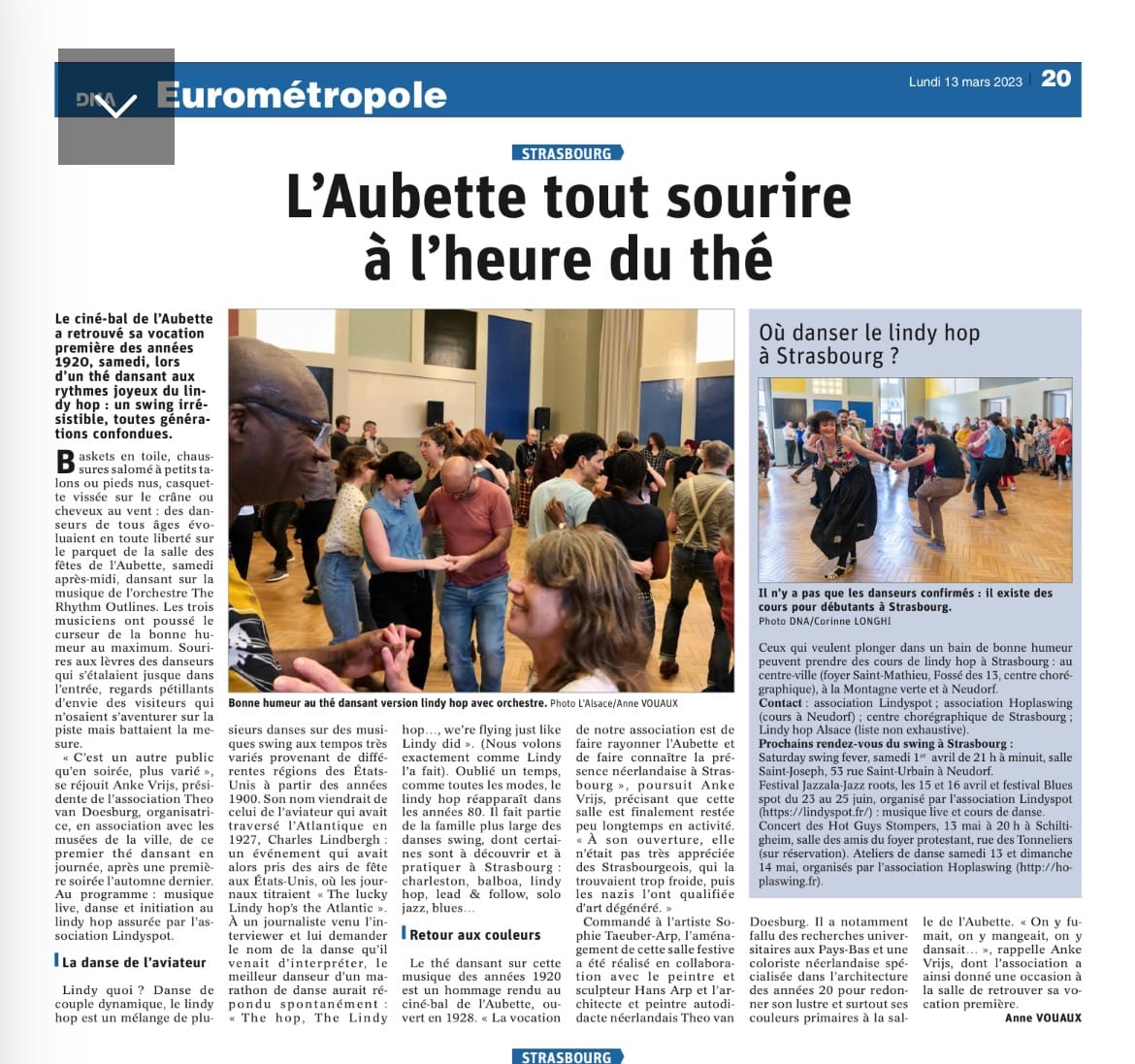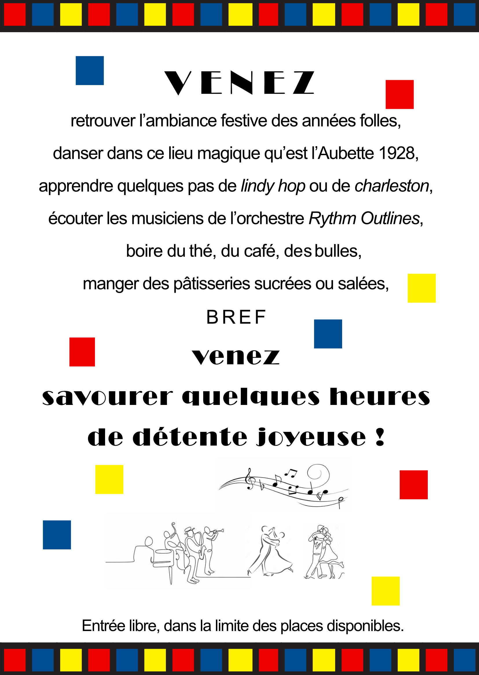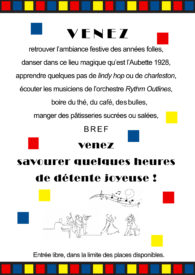 venez danser ou simplement écouter l’orchestre Rythm Oulines en buvant une boisson accompagnée d’une pâtisserie dans une ambiance » Années folles « , l’époque où un trio d’ami.e.s artistes ont créé ces salles magnifiques de l’Aubette 1928. Le cas échéant vous pourrez même profiter de cours de danse (gratuites) pour vous familiariser avec les pas de lindy hop ou de charleston !