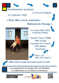 La compagnie « Ce que peut l’orage » vous invite de l’accompagner dans une déambulation poétique et dans une rêverie dansée à l’Aubette 1928. Il s’agit du premier volet d’un triptyque de performances qui auront lieu en préfiguration du centenaire de l’Aubette en 2028 : ce qui nous est resté, ce qui a disparu.
