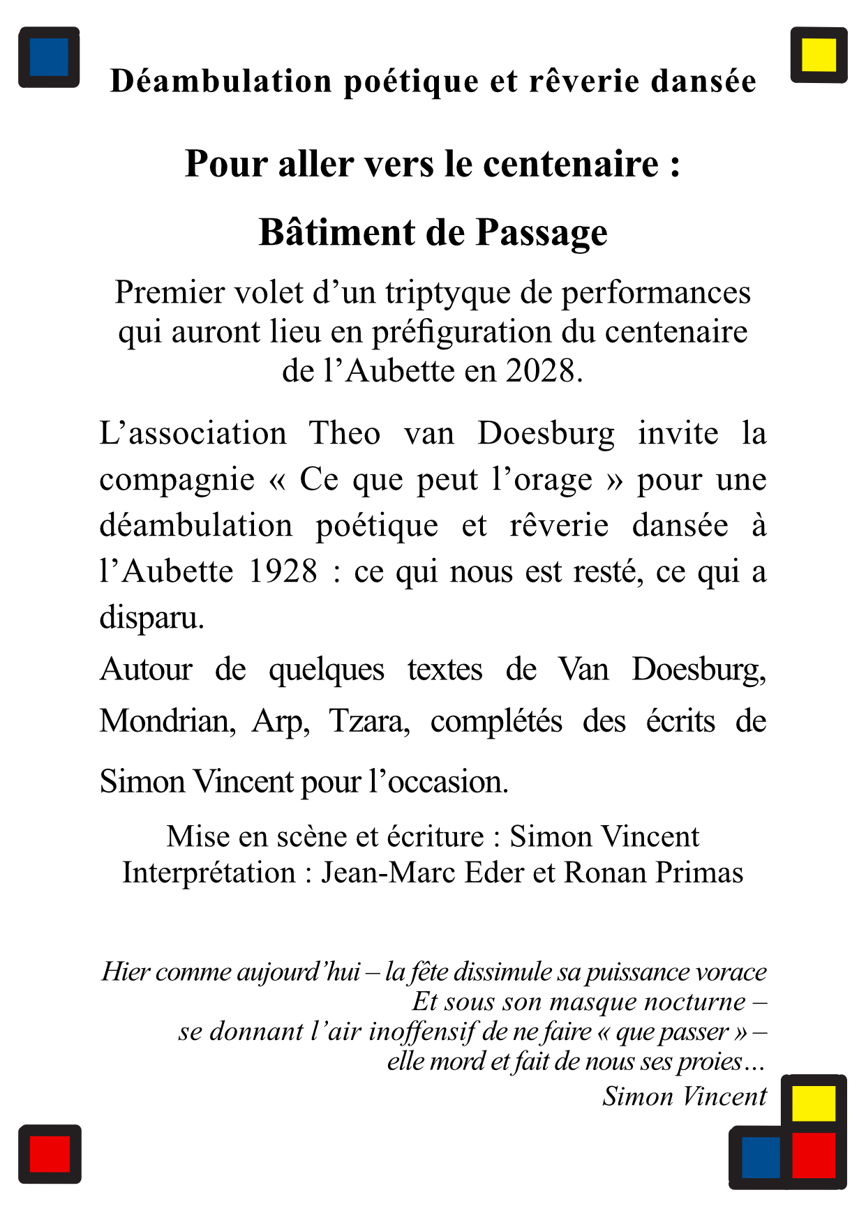 Autour de quelques textes de van Doesburg, Mondrian, Arp, Tzara, complétés des écrits de Simon Vincent pour l’occasion vous aurez droit à la première étape « Pour aller vers le centenaire : Bâtiment de Passage » .