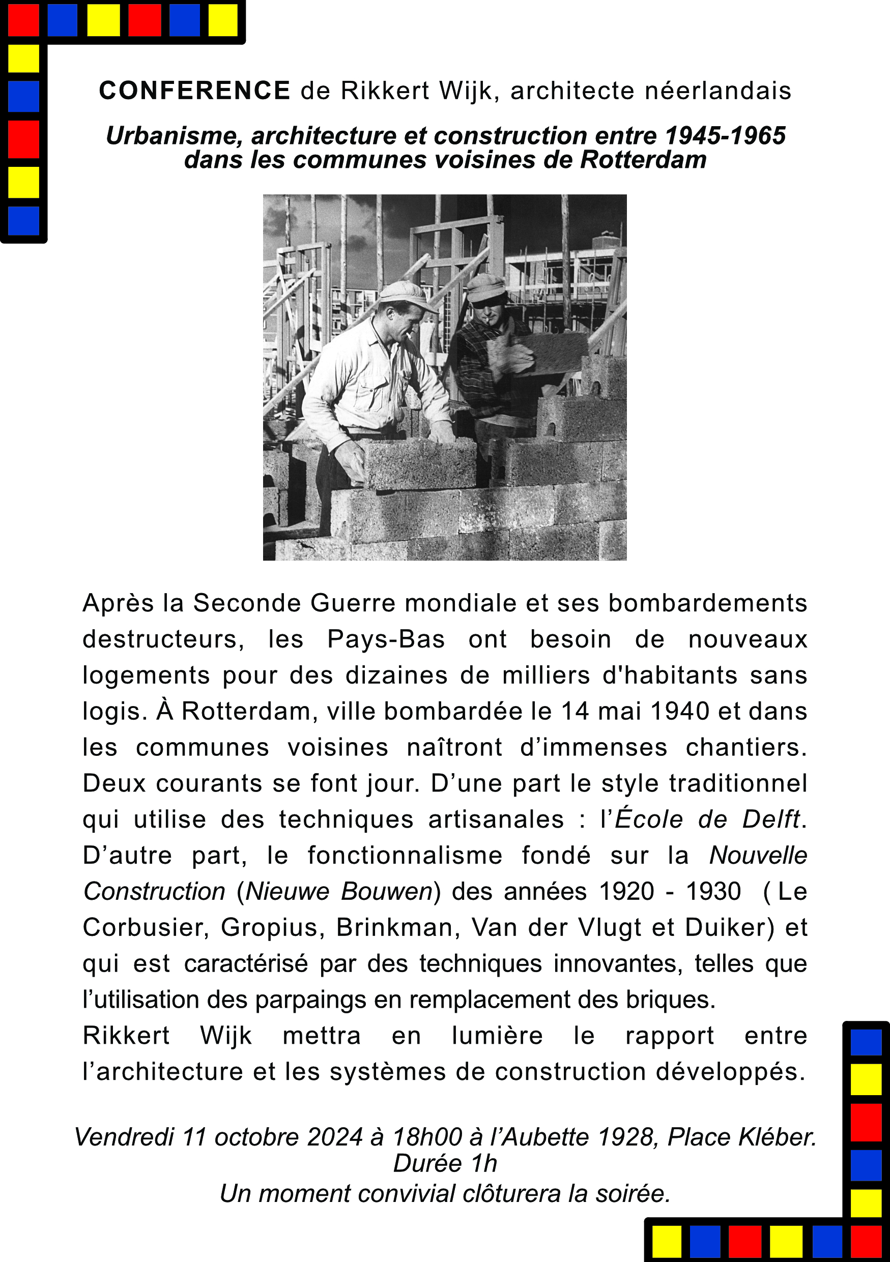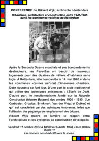 Après la Seconde Guerre mondiale et ses bombardements destructeurs, les Pays-Bas ont besoin de nouveaux logements pour des dizaines de milliers d’habitants sans logis. Dans les communes voisines de Rotterdam, d’immenses chantiers naîtront faits de constructions fonctionnelles aux techniques innovatrices. Dans cette conférence, Rikkert Wijk évoquera l’École de Delft et la Nouvelle Construction (Het Nieuwe Bouwen) et mettra en lumière le rapport entre l’architecture et les systèmes de construction développés.